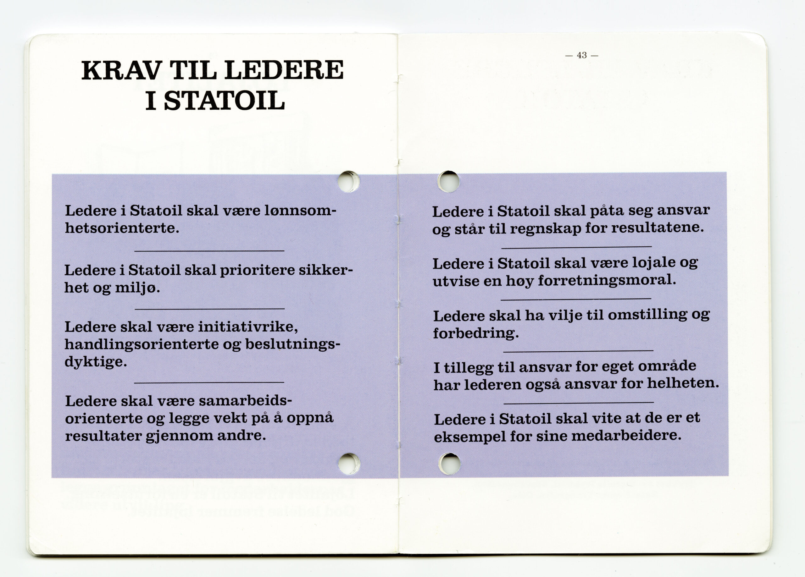 In his view, an important task was developing the organisation. He was always careful to keep people informed and to involve the unions. Norvik drew 60 senior Statoil executives and union leaders into developing a management strategy during the autumn of 1988. That collective effort yielded a 50-page document on goals, values and management. Known in Statoil as “Harald’s Little Blue Book”, this was intended to lay the basis for the company’s corporate culture. All employees, and managers in particular, had to internalise it.[REMOVE]Fotnote: Interview with Finn Harald Sandberg, 21 September 2020.